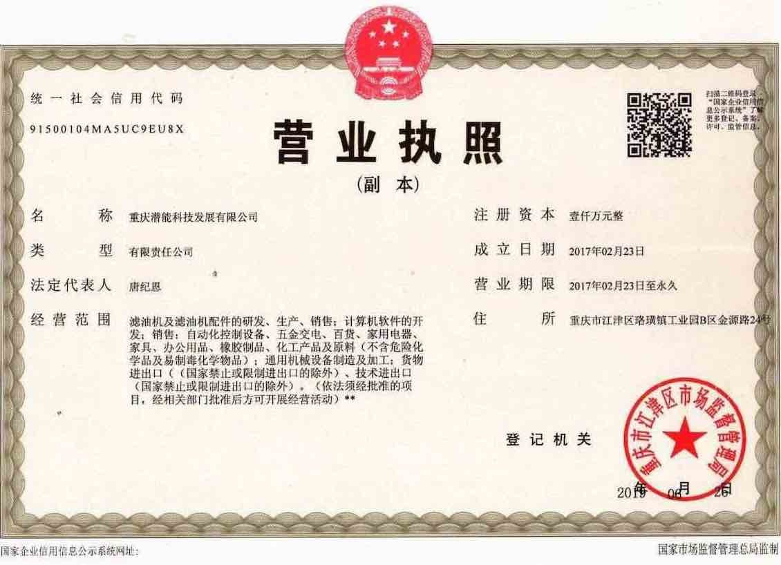 重慶潛能科技發展有限公司于1993年創建于重慶市大渡口區,是一家專業研發制造流體凈化設備的高新技術企業。公司多年來不斷謀求創新發展,廣泛吸取國內外先進的流體凈化技術,并溶入到研發制造中,現已成長為品質卓越、性能穩定、品種齊全的大型流體凈化設備制造企業。生產銷售各型濾油機廣泛用于電力、石油、化工、冶金、航空、船舶、機械、軍工、汽車制造、水泥、造紙等多個行業,已有各類用戶近千萬家,并出口到100多個國家和地區。多年來我司秉承誠信立業,不斷致力于為用戶提供滿意的流體凈化處理方案,不僅為客戶實現高效凈油和節油目標,也開創了環保節能的新局面。